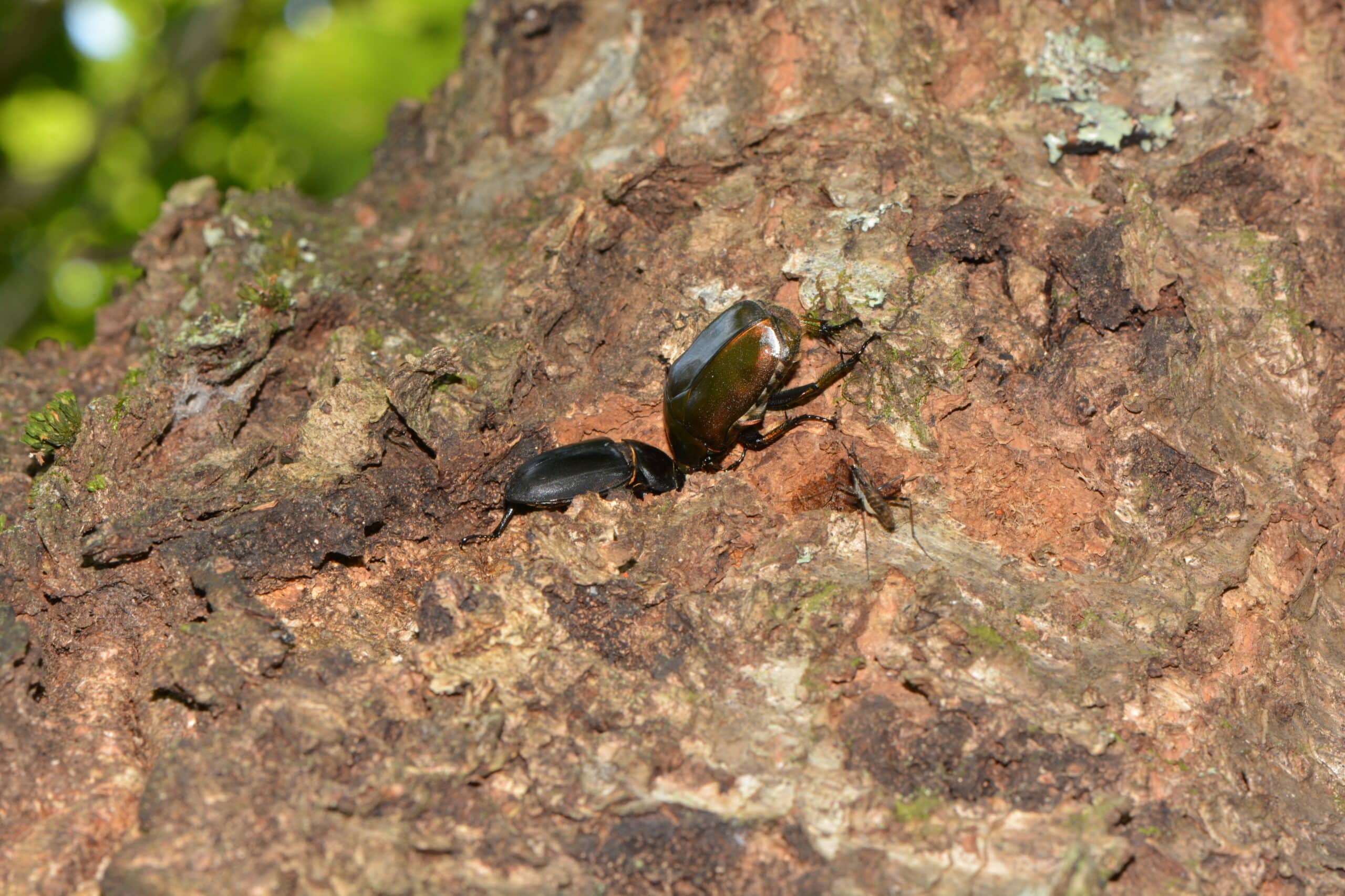 茅葺古民家を出発してすぐ目に入ったのが、ミズナラの樹液に頭を突っ込んでいたコクワガタとカナブン。